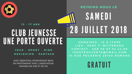 Les activités reprennent tranquillement à la Porte Ouverte, avec deux nouveaux clubs jeunesse, prévus les 1er et 15 septembre, pour les 13-17 ans. Ils ont lieu pour l’instant au parc François Mitterrand, mais par la suite des activités pourront être proposées plus loin : Parc Aventure, via ferrata… en fonction des possibilités.
